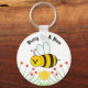 A yellow and black bee with the words Busy As A Bee in curved text above. Below are yellow, red and green flowers.