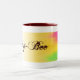 Imagine a charming coffee mug that exudes whimsy and cheerfulness. Its ceramic surface is smooth and glossy, catching the light in a playful dance of colors. Against a backdrop of soft pastel hues that resemble a sunrise, a vibrant bumble bee takes the stage.
