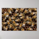 A swarm of bees clusters on a honeycomb, displaying their characteristic black and yellow stripes. The intricate hexagonal pattern of the honeycomb forms a contrasting backdrop to the busy activity of the bees.