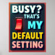 Modern typographic poster with witty wordplay about busyness. Features bold 3D letters in turquoise, yellow, and pink with a red toggle switch graphic.