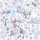 A cute and beautifully detailed watercolor-painted bustling mountain alpine ski village with snowy mountains, chalets and shopkeepers, skiers skiing, visitors building snowmen, villagers gathering, children playing, dogs barking and Christmas bells a'ringing in this illustrated winter holiday pattern.