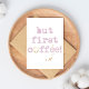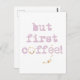 NewParkLane - Postcard, with fun quote 'But first coffee!' in an old fashioned typewriter font in lavender / purple, with the letter 'o' being a coffee stain.