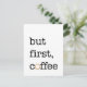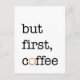 Inspirational postcard displaying the phrase "But first coffee" in black type on a white background with a brown coffee stain.