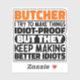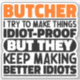 Funny Butcher Sayings "Butcher I Try To Make Things Idiot Proof But They Keep Making Better Idiots". Grab this Funny Butcher design as a funny gifts for an awesome mom, dad or friend.
