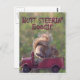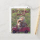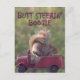 Cute, funny image of Squirrel in an old red wooden toy truck with title “BUTT STEERIN’ BOOGIE”