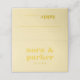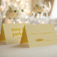 Chic, bold typography takes the cake with these modern wedding place cards. A fun surprise peeps through as the bottom side features bright and cheerful yellow, flowing with the buttery soft yellow throughout the background and text.