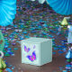 Rainbow butterflies against a light blue background with florals on top.