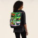 Backpack with a collage of six butterflies, among them the Old World swallowtail (Papilio machaon), yellow, black, blue, and red; the peacock butterfly (Aglais io), red with colorful round spots; the black-and-blue blue tiger butterfly (Tirumala limniace), the buckeye butterfly (genus Junonia), brown with colorful round spots; and the fritillary butterfly, yellow with black spots.