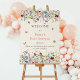 This is an elegant and sweet baby shower welcome sign foam board. The design features sweet and whimsical butterflies and bees around fields of beautiful, summery delicate wildflower florals in pretty shades of blue, terracotta, pink, rust, purple and yellow.