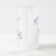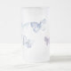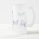 A frosted glass mug decorated with a delicate butterfly design in soft blues and purples.