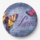 Butterflies and love text on blue textured background with calligraphic artwork.