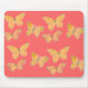 A pretty pink mousepad, decorated with orange/pink butterflies.