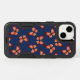 This phone case features a pattern of flying butterflies in hues of pink and orange with black bodies. The dark blue background color is easy to customize.
