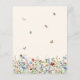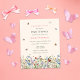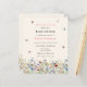This is a budget friendly elegant and boho baby shower invitation. The design features whimsical butterflies and bees around a field of summery delicate wildflower florals in pretty shades of blue, terracotta, pink, rust, purple and yellow.