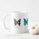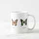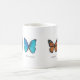 Four colorful butterflies each with names printed below wrap around a white mug.