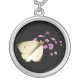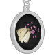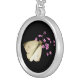 This necklace features the exquisite cabbage butterfly (Pieris rapae). She has stopped flitting around the garden long enough to perch on a verbena blossom. She has a black body which does not show beneath her four white wings, each with a black dot at the center. The two upper wings have a black band at the tips. Her face is a pale green. She is a lovely, delicate creature.