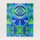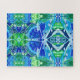 Puzzle in a digital batik pattern of a large butterfly on an ornate, arabesque medallion background, in shades of cobalt blue, turquoise and jade green