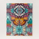 Puzzle in a digital batik pattern of a large butterfly on an ornate, arabesque medallion background, in shades of amber, orange, aqua and beige