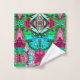 Towel set in a digital batik pattern of large butterflies on an ornate, arabesque medallion background, in shades of turquoise and deep rose pink