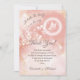The top portion of this artistic girl baby shower thank you card features a white butterfly in a halo and white flowers on an apricot blush pink watercolor background. The ink watercolor background has golden spots mixed with white transparent flowers. With a headline that says: "A little butterfly is on her way", Thank You words in an elegant calligraphic script and a custom text with custom names.