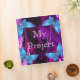 Four turquoise and blue butterflies against a pretty pink, purple and mauve background.