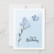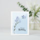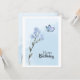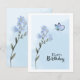 A delightful birthday card featuring a delicate blue butterfly flitting among a cluster of vibrant blue flowers. The background is a calming shade of blue. The card also features the message "Happy Birthday" in a black, cursive font.