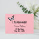 A beautiful butterfly flies on this pink moving announcement card that says 'I have moved'. Personalize with your name and new address. Butterfly on back also.