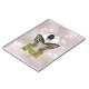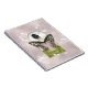 This imaginitive and truly unique dream-like design features a fantasy fairy-like woman with her back turned gazing out at the dreamy cloud-filled sky. She has a pair of butterfly wings on her back as though she can fly. Smaller white butterflies are scattered over the design against a shimmering pearl-pink cloud filled sky. A text template is included to personalize this notebook with your monogram initials.