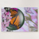 This puzzle image features a beautiful scene of butterflies and flowers. A large, vibrant monarch butterfly with striking orange and black wings is the central focus, set against a backdrop of soft pink flowers. Surrounding the monarch are other butterflies, including a delicate pink butterfly in the background. The overall composition is enhanced with a glossy, spherical effect, giving the image a dreamy, ethereal quality.