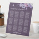 An elegant purple floral wedding seating chart pedestal sign featuring soft watercolor flowers in lavender, blush, and white, accented with a delicate butterfly for a romantic finishing touch. The rich plum background and floral top border create a refined and stylish display, perfect for helping guests find their seats at your wedding reception. A beautiful choice for couples creating a coordinated floral wedding stationery and signage suite.