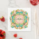 Butterflies are one of the most welcome visitors to a garden and gardeners go to great lengths to attract them. Beautiful turquoise and green butterflies circle around a burst of white and peach-colored flowers and green leaves in this intricate, symmetrical design. A lovely customizable design for wedding or baby showers.