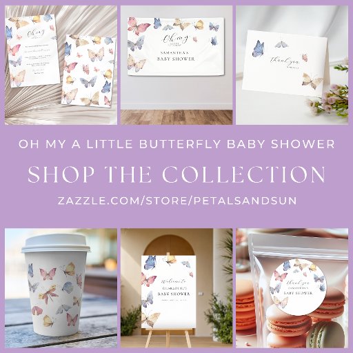The phrase “Oh my, a little butterfly” is highlighted in a graceful modern script font, perfectly complementing the soft, playful palette of pink, beige, sunny yellow, magenta, and royal blue. This paper favor blends modern elegance with a touch of fairytale whimsy — ideal for a spring, garden, or butterfly-inspired baby shower.