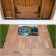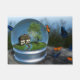 Inside a "snow globe" is a summer landscape with a cottage overshadowed by maple and cherry trees. The surrounding grassy field is filled with lilies and wildflowers in bright colors. Roses and ivy climb the wall of the little house. It's a late summer day, and a thousand bright orange and blue butterflies swirl around the globe.