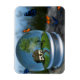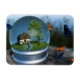 Inside a "snow globe" is a summer landscape with a cottage overshadowed by maple and cherry trees. The surrounding grassy field is filled with lilies and wildflowers in bright colors. Roses and ivy climb the wall of the little house. It's a late summer day, and a thousand bright orange and blue butterflies swirl around the globe.