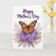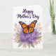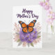 This card features a detailed orange butterfly with wings spread wide, marked by black veins and tiny white spots along the edges, resting gently on a cluster of soft lavender flowers ❤️. The blossoms have subtle shading that suggests a velvety feel, and each one is dotted with a warm yellow center that adds a cozy, caring touch. Around the main scene, muted fronds and slender leaves flow outward like a quiet embrace, mixing dusty rose, pale gray, and gentle olive green. The white background keeps everything airy and bright, letting the butterfly and flowers feel like they’re sharing a tender moment together. Near the top, the message “Happy Mother’s Day” sits centered in deep violet lettering, standing out clearly against the open space. The natural elements gather mostly along the lower portion, creating a balanced look that guides your eyes upward to the words. A small 🌼 accent could easily fit beside the message without crowding the design. The butterfly is positioned slightly above the lavender blooms, with foliage curling around the cluster in soft, tapered shapes.