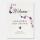 An enchanting watercolor illustration with a butterfly theme, featuring purple butterflies and purple and pink wildflowers in a cute, adorable style. The elegant, playful swash calligraphy puts an extra touch on the title and decorates this baby girl shower welcome board that is perfect for a spring or summer celebration.