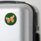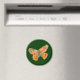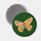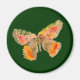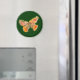 A deep green circular magnet with a pretty butterfly motif in pinks and oranges.