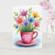 Designed with a joyful floral bouquet spilling out of a deep red teacup, this illustration feels like a gentle hug ❤️. Coral, pink, purple, blue, and yellow blossoms cluster tightly together, with leafy greens lifting upward as if leaning in close like friends sharing a secret. The background stays bright white, letting the soft, watercolor-like textures and tender color transitions do the talking. “Happy Mother’s Day” appears on the front of the cup in dark lettering, sitting over a magenta paint splash that makes the words stand out. A thin gold-toned rim circles the cup, and it rests on a pale pink saucer with a matching metallic edge. Faint butterfly shapes in light green drift around the flowers, adding a calm spring touch 🌼. A soft blue wash sits beneath the saucer, like a light shadow pooling on the page.