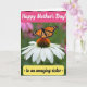 This greeting card features a close-up of an orange-and-black winged insect with tiny white edge spots resting on the spiky orange center of a white flower, like a gentle pause shared between two quiet companions ❤️. The white petals fan outward in soft layers, creating a calm focal point that feels like an affectionate glance held a moment longer. Behind them, the garden background fades into a smooth green blur with faint pink touches, giving the scene a cozy, tucked-away setting. A wide fuchsia banner runs along the top with a cheerful greeting in flowing cursive-style lettering. A second banner stretches along the bottom in sunny yellow, carrying a short note of appreciation in a simple, easy-to-read font 🌼. The bright banners frame the natural scene like a friendly embrace, adding warmth without distracting from the delicate details. You can make out the insect’s slender antennae and the fine texture of the flower’s orange disk beneath it. The top fuchsia strip and the bottom yellow strip sit across the image with their text centered and clearly contrasted against the solid color bands.