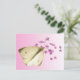This postcard features the exquisite cabbage butterfly (Pieris rapae). She has stopped flitting around the garden long enough to perch on a verbena blossom. She has a black body which does not show beneath her four white wings, each with a black dot at the center. The two upper wings have a black band at the tips. Her face is a pale green. Although she is a lovely, delicate creature, her caterpillars devour cabbages and other member of the brassica family of vegetables. The reverse has one tiny butterfly on a pale pink gradient background.