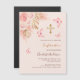 A peach background. Decorated with rose gold and pink florals, roses, pampas grass, butterflies and a golden cross. Personalize and add your name and details details.
