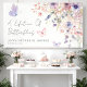 A Lifetime of Butterflies Horizontal Bridal Shower Banner. Add a touch of whimsical romance to your bridal shower with this charming horizontal banner, perfect for an "A Lifetime of Butterflies" themed celebration. The artwork features a delicate mix of watercolor wildflowers and greenery, with multiple pink and purple butterflies fluttering across the layout. The color palette includes blush pinks, dusty rose, lilac, lavender, violet, and fresh greens for a soft, garden-inspired look.