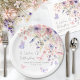 Add a touch of whimsical romance to your bridal shower table with this charming paper plate design, perfect for an “A Lifetime of Butterflies” themed celebration. The artwork features a delicate mix of watercolor wildflowers and greenery, with pink and purple butterflies fluttering across the plate. The color palette includes blush pinks, dusty rose, lilac, lavender, violet, and fresh greens for a soft, garden-inspired look.