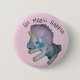 Unicorn magic depicted by a rainbow colored unicorn doll in crochet. Mane is pink, horn is yellow, eyes are black. Curved text reads "let Magic Happen. On light pink background.