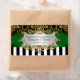 Elegant, chic and stylish customizable party accessories with a black and white striped pattern, a black and gold damask pattern, a green satin ribbon and a gold filigree look label.