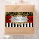 Elegant, chic and stylish customizable party accessories with a black and white striped pattern, a black and gold damask pattern, a red satin ribbon and a gold filigree look label.