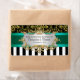 Elegant, chic and stylish customizable party accessories with a black and white striped pattern, a black and gold damask pattern, a teal satin ribbon and a gold filigree look label.