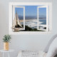 Enjoy a view of the ocean waves from this fake window poster that gives you the impression of looking out through a window. The beautiful scene beyond is of an ocean with big white waves crashing against the sand of the shore. In the distance you can see a line of mountains beneath a cloudless blue sky. On the 'windowsill' of this white-painted window is a little sailboat with fabric sails. A perfect scene for anyone who loves sailing, surfing or simply to admire a sea view no matter where they live.