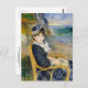 A postcard with the painting, By the Seashore (1883) by the French painter Pierre-Auguste Renoir (1841-1919). A portrait of a seated young woman in a blue Victorian dress and bonnet on the beach at the seacoast. Renoir was deeply influenced by renaissance art after a trip to Italy in 1881-82.