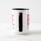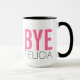 Bold, black and bright pink letters with a hip cool saying that's all over the internet lately. This is a popular way to say goodbye when some random or basic person is leaving and you really couldn't care less. The same design is on both sides of the mug so your message can easily be read by you and the felicia type person whether you are left handed or right handed.